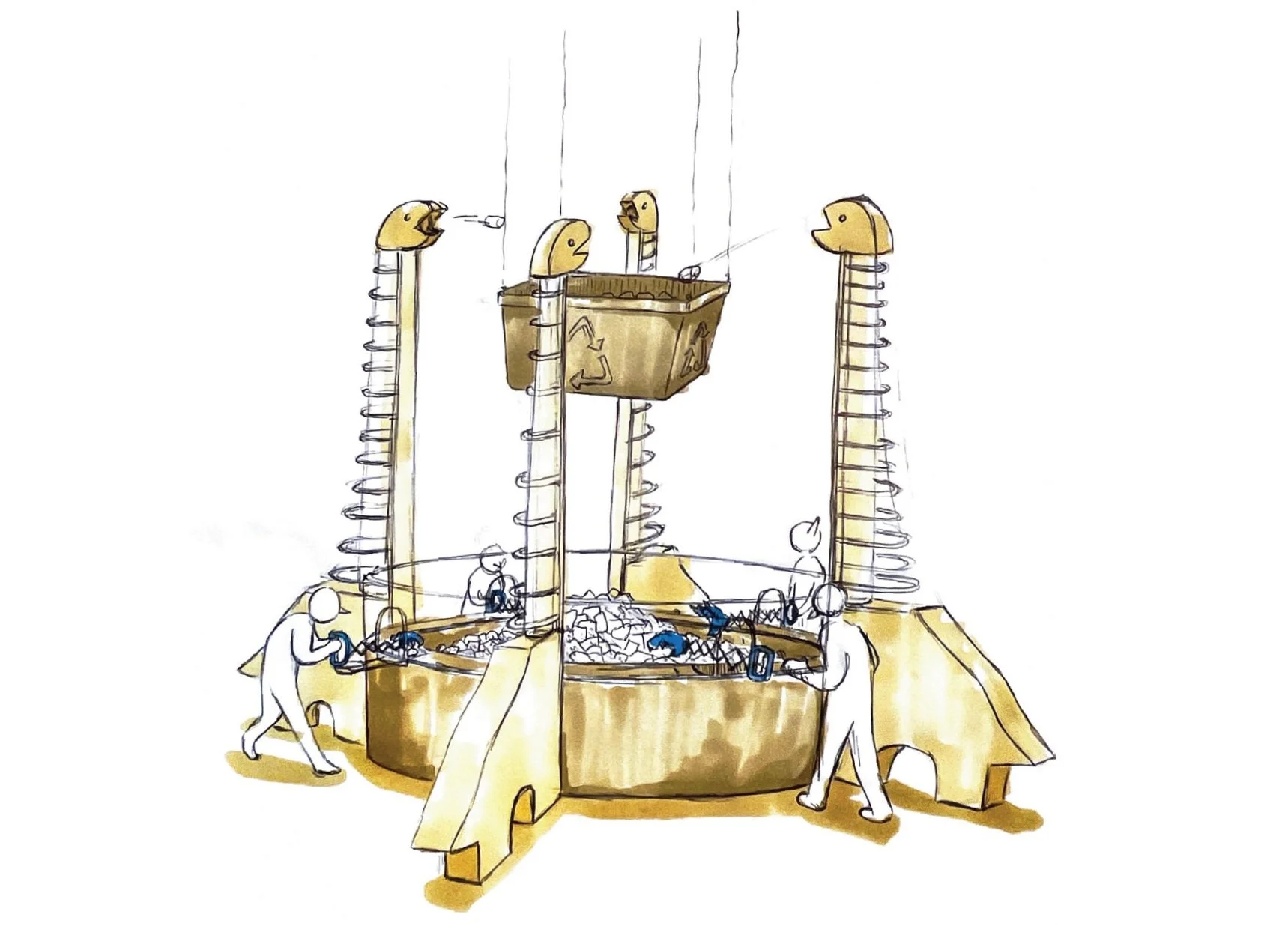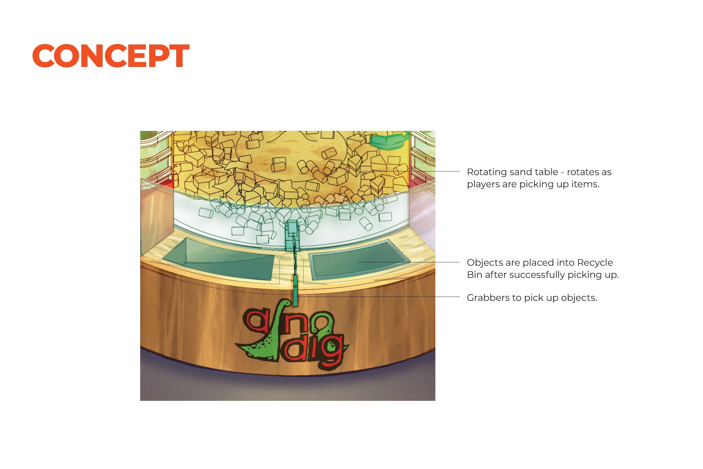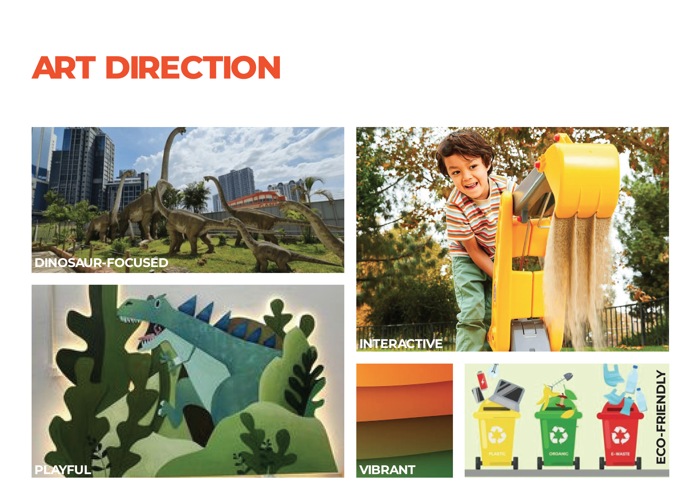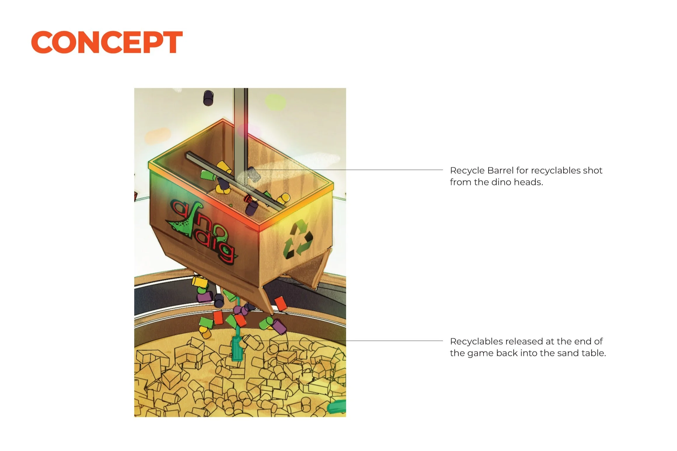 The initial drafts of an immersive interactive- inspired by the themes of recycling, circular economy, and dinosaurs! Featuring ideation sketches, 3D models, and mock-up illustrations of the interactive.